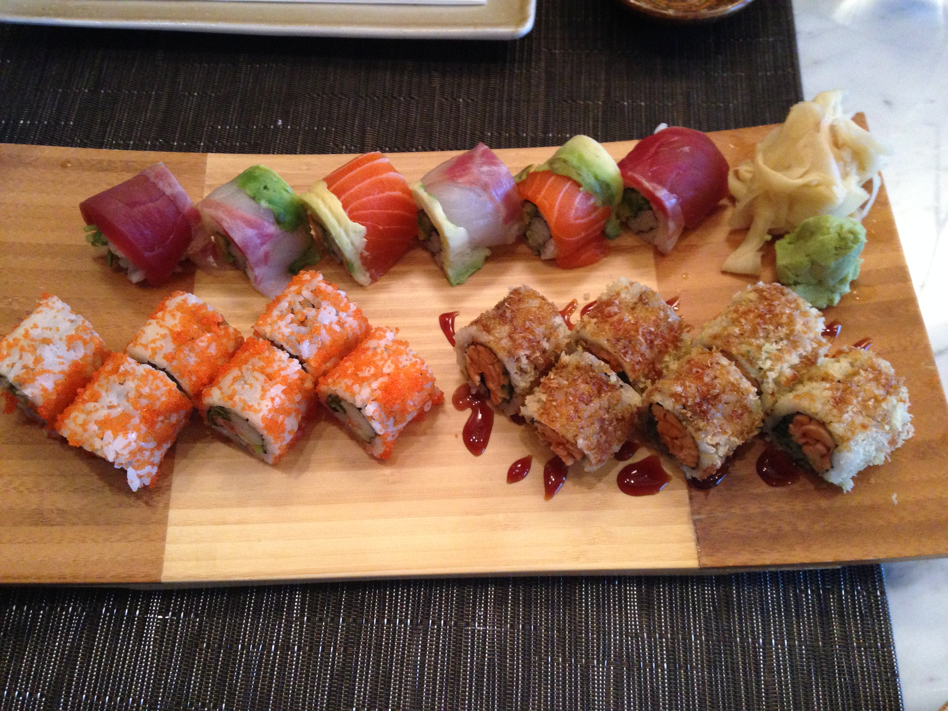 Başlangıç için edamame; ardından ana yemek için sushilerden California Roll; ilk defa denediğim ve bayıldığım pişmiş balıkla hazırlanan Sake Teriyaki Roll; levrek, somon ve ton balıklarından hazırlanan ve sunumu ile gerçekten rengarenk bir görünüme sahip olan Rainbow Roll.