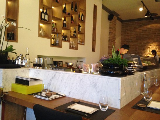 Mekan, lokasyonuna tezat olarak kapısından girdikten sonra ambiyansı ile sizi yanıltmayacağını hissettiriyor. Taş duvar kaplamaları, sade kombinasyonlu dekorasyonu, devasa ışıklandırma aplikleri, tam ortada konumlandırılmış sushi barı, hem kalabalık gruplar için büyük hem de başbaşa yemek için iki kişilik masaları ile sizi yormayan bir atmosfere sahip.